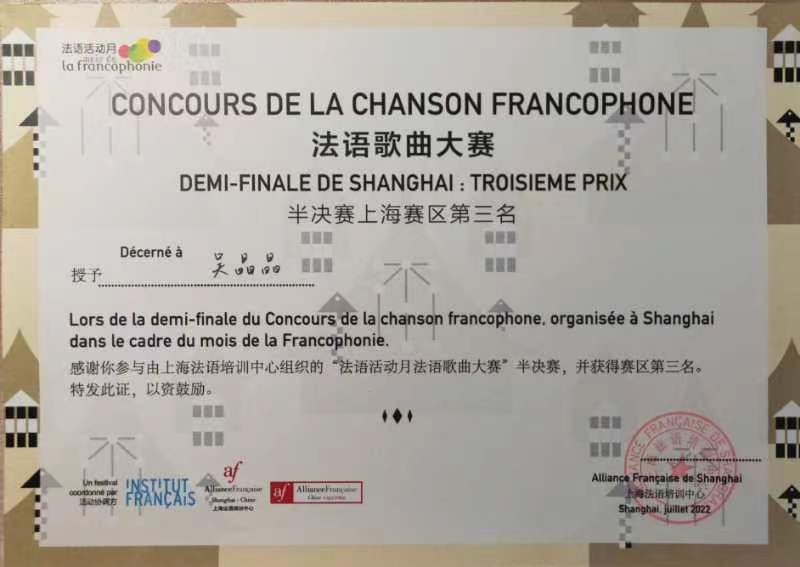 2022全国法语歌曲大赛半决赛上海赛区于9月4日顺利收官!本次比赛以线上线下相结合的方式举行,12名参赛选手以线上方式参加比赛,评审团采取线下到场评判。威尼斯官网国际交流学院学生吴晶晶同学在外语学院法语教师朱文婧的指导下,荣获半决赛上海赛区第三名!2022全国法语歌曲大赛半决赛在上海总共进行了三轮比拼,在长达6个月的赛程中,吴晶晶同学始终坚持“信念使快乐真实”,一路过关斩将,从上海赛区的73名选手中脱颖而出。供稿 | 国际交流学院、外语学院